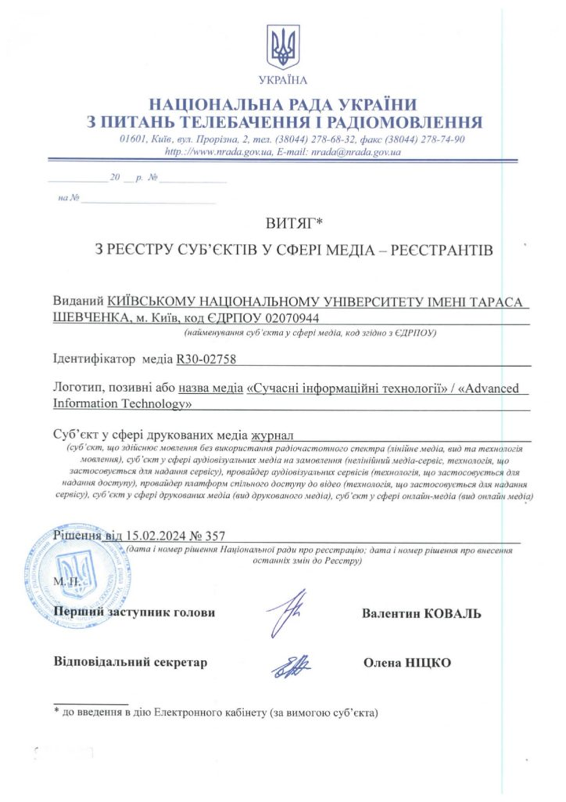 Місцезнаходження редакції: Київський національний університет імені Тараса Шевченка, Факультет інформаційних технологій.